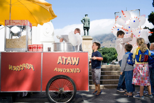 Yesterday while quickly blogging about the Carl's Jr commercial shot that utilized Cape Town as a stand-in for Istanbul, I was reminded of French photographer Cecile Mella's project "Fictional Cape Town." There Mella documented the manufactured worlds produced by advertising firms using locations around Cape Town as a stand-in for European, British or American scenes. "… A characteristic wine farm is transformed into a Dutch homestead, or a Long Street café becomes a Parisian bistro for a day or two." Not surprisingly these ads contribute to the racial political economy of the city. There's lots of work for mostly local and expatriate whites as actors, models and extras in front of cameras. Blacks, with few exceptions, it seems do lots of the heavy labor in the industry. Why Cape Town? It is cheaper — the favorable exchange rate — to shoot and it comes with good infrastructure. Mella has written that the advertising industry "semi-colonizes slices of the city," but that she hopes attentive viewers can catch the glimpses of the real Cape Town in her images of these "crooked landscapes" manufactured worlds. Here we're posting some of the images. The one above is for a "worldwide campaign for a cereal brand commissioned by UK-based clients." Below, the Company's Gardens are transformed into Poland for "a national campaign for the Polish branch of a global phone network company."