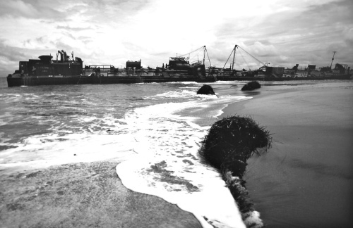 Tiwani Contemporary is the latest art space in London devoted to contemporary African art. Affiliated with the non-profit Centre for Contemporary Art (CCA) in Lagos, Tiwani promises to connect artists in Nigeria with buyers in London. "The Tie That Binds Us," a group show which collects five artists, opened in December 2011. These artists, all Nigerian and Nigerian-British, work across a range of different media. Lawson Okeyan's plaster ceramic eggs are intriguing and pleasing, though placed too close to the floor for inspection. Adolphus Opara's Shrinking Shorelines series (above: 'Shrinking Shorelines No. 5'), poised between art photography and photojournalism, draw wrecked machines against the clear lines of beach, sea and sky. The oil-black ink of these elegant monochrome images is a dark reminder of the industrial contamination threatening the Nigerian landscape. The exhibition also features Mary Evans' works on paper and a video piece and a Lagos soundscape by Emeka Ogbod.