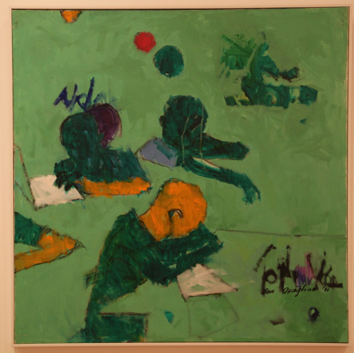 Osaghae's 'Vernacular Class' sketches students at a class, quick and attentive as a Degas, moving between abstraction and representation, marks on the flat surface of the canvas and suggestions of three-dimensional space, mapping the interplay of inner and outer worlds. The painting configures the students' mental geography: they inhabit the painting dilligently, bent over their work. The dark blue bodies take on a certain weight against the turquoise background, they appear suspended heavily in space. There is no motion in this picture, in the studied poses of these studious children. No time ever passes; this picture is inhabited by boredom. The objects placed above their heads may be the objects of knowledge or distraction. The scribbling on the surface of the canvas is unfinished, inconclusive. Heidegger claimed that boredom is, in its most essential form, the experience in which being and time unite, the critical experience which makes philosophy possible. Osaghae's images are open to the question of being in the world, and responsive to the shifting boundaries of individual life. The gallery description of the work foregrounds its socio-political content: