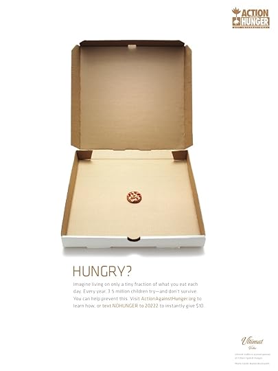 The first is the pizza, a miniscule aperitif drowning in a sea of cardboard packaging, the kind of meagre repast we'll surely all have to make do with when Herman Cain is sworn in. The pizza add has been attacked by NYU's Paul Light, who wants the ad "redesigned to focus on good food, not what many givers would see as a very unhealthy option." Light is understandably concerned that people will mistakenly suppose that Action Against Hunger is simply a lobbying group for more and bigger pizzas.