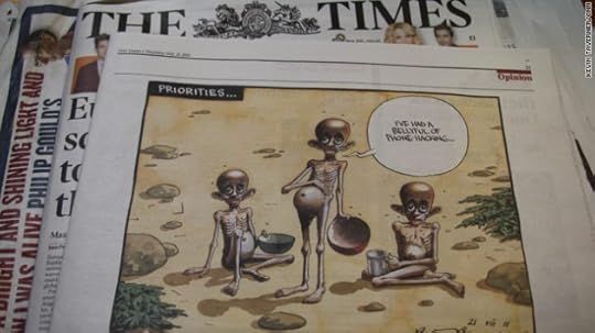 So how to deflect a scandal that may lead to severe restrictions of one's sphere of influence? Use your own PR company, and have one's editorial cartoonist link a) with b). The Times of London, owned by Rupert Murdoch's News Corp, had resident cartoonist Peter Brookes draw up "Priorities," a cartoon depicting a group of starving figures in a desert environment; one figure clutches the tell tale empty begging bowl, and states, "I've had a bellyful of phone hacking." (Peter Brookes, btw, has a thing for drawing starving Africans.)