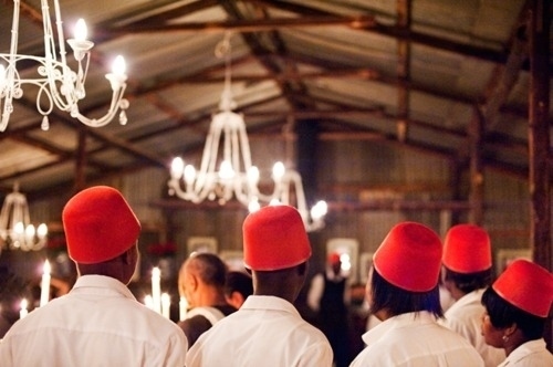 UPDATED: The blogs have rightly been outraged at a white couple, "Dave and Chantal," who decided on a "colonial" (and Apartheid) theme at their wedding in South Africa complete with an all-black waiter staff in red fezes. Like it was a scene out of the film "Out of Africa." (Turns out the happy couple asked for a recreation of the film. Serious.) The wedding was held in Mpumalanga province on the border with Mozambique. The wedding organizers got the props–which included "antique travel chests, clocks, globes and binoculars and an awesome Zebra skin"–from a "prop house" in the capital Pretoria. This kind of thing which is apparently the in-thing (i.e. sold as "tradition" and "nostalgia"), would have passed unnoticed, but for the internets. The couple or their photographer felt pleased enough to post the pictures on a photography site. Then it was spotted by the American blog Jezebel (part of the Gawker empire). Once it became viral (and the couple their photographer and wedding planner were ridiculed) some of the photos (i.e. those with blacks in subservient positions or white people hamming it up in pith helmets) have been taken down. Here's a link to the "cleaned-up" cache-page since the page has been deleted. Luckily for us screen shots of the pictures exist. Of course, not surprisingly, some white South Africans are defending the couple. (Although one commenter spoke the truth: "Most white folks' weddings in [South Africa] are colonial not by design, but by default.")