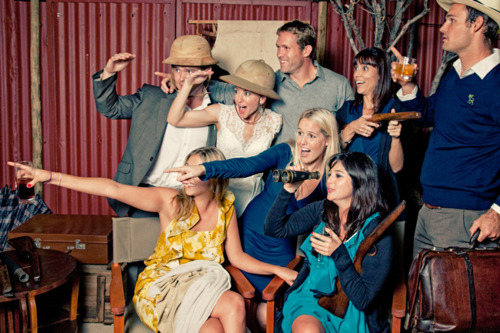 Neelika Jayarwadane adds: First, the pith helmets, the rolling amber whiskey, the monogrammed blue sweaters: it's like a Tommy Hilfiger/ Ralph Lauren advert for Fall-wear, in the conservative chic for which these brands are known. But allow me a little snark here: who wears a blue sweater, no matter how finely monogrammed, to a proper wedding? I see it's all very shack-chic-themed, with corrugated walls and chandeliers, but still, lovey.