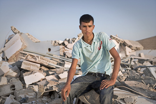 His home was destroyed a week after they received the court order: "Many policemen arrived at the village, evicted us out of the house and destroyed it together with 6 other buildings." In the image, Sliman sits on the rubble that is left after his home was demolished.
