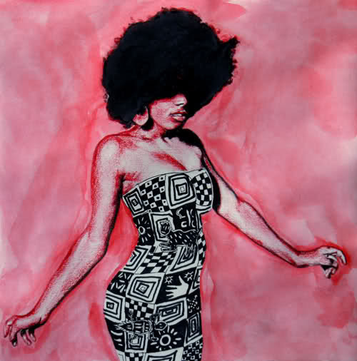 I've just completed a set of drawings [colored pencil, ink, and watercolor on paper; the one above is 'Woman in Igbo Print Dress'] … This drawing is called "Woman in Igbo Print Dress." The pattern on the dress is inspired by Ukara cloth. This kind of cloth incorporates symbols that are designed to give it meaning and power … Although I have roots in Nigeria, I have never been there and I want to explore that side of my ancestry. However, I feel that I am learning about Nigeria while naturally using America as my point of reference.