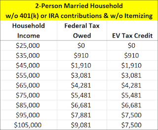 You can see that for taxpayers fitting this profile and making under about $95,000, the $7,500 EV tax credit is a myth. For a couple making $55,000, the credit is less than half the full amount. For a couple getting by on $25,000, there's no tax credit at all.