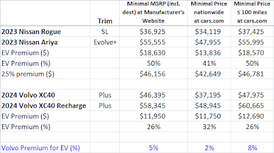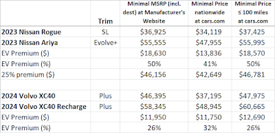 Average 60-month new car loan rate (per https://bit.ly/3QUl7ER)The concomitant reduction in demand for new cars has changed the market. I decided to recheck the EV price premium by again comparing the cost of the Nissan Rogue with the equivalently-equipped Nissan Ariya. This time I checked not just MSRPs, but also prices at cars.com. I did two searches at cars.com. The first was nationwide, i.e., for the best price I could find anywhere. The second was "near me," which means within about 100 miles of Portland, Oregon. I then repeated the experiment for the Volvo XC40 (gas-powered) and the Volvo XC40 Recharge (batteries). For the Nissans, my data are for the 2023 model year, because the 2024s aren't out yet. The Volvo data are for the 2024 model year.