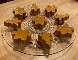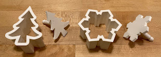 Nevertheless, proof of concept! I found that the KindredDesignsCA shop at Etsy offered custom-made 3D-printed cookie cutters. They agreed to make extra-deep cutters for me, one in the shape of a tree, another in the shape of a snowflake. The cutters worked great, except that once I'd extracted a piece of pumpkin pie with a cutter, the pie stuck inside the cutter. I had KindredDesignsCA make plungers so that I could push the pie out of the cutters: