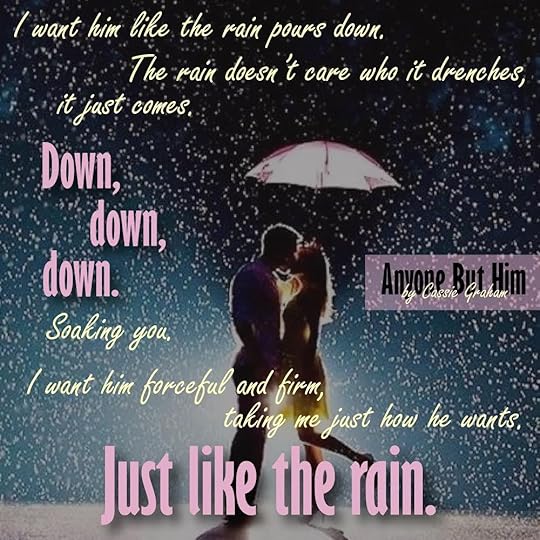 His grip on my hair tightens as the kiss deepens. We moan together, feeling the pleasure poring from our bodies. His lips are sweet at first. Restrained and guarded. Almost as if he’s willing himself to slow down. But, I don’t want him controlled. I want him wild. I want him like the rain pours down. Taking no prisoners. The rain doesn’t care who it drenches; it just comes down, down, down. Soaking you. I want him forceful and firm, taking me how he wants. Just like the rain.