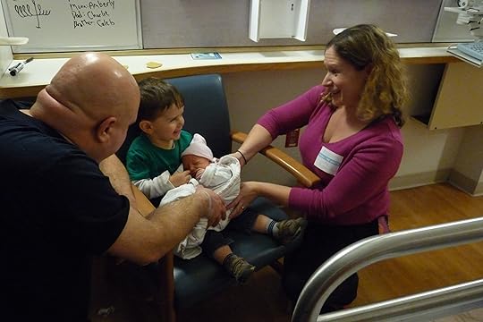 Delighted big brother gets to hold little sister with Daddy Charlie and our daughter, Aunt Becky.