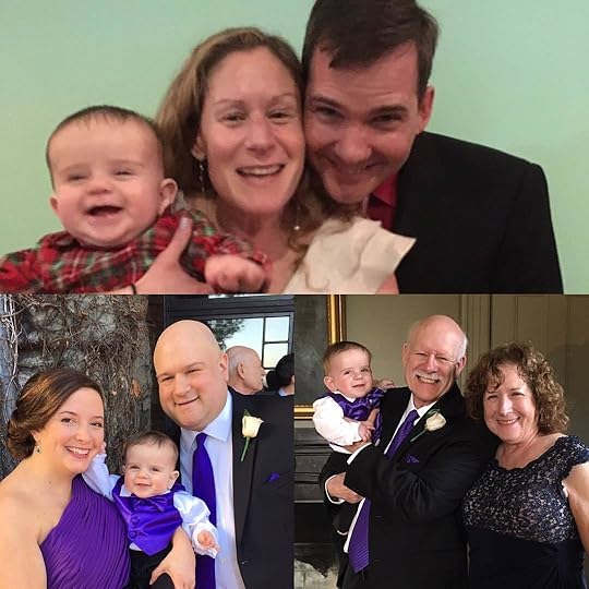 Top: my party animal grandson, Caleb, with his Aunt Becky & Uncle Dan at the night-before-the-wedding karaoke party; bottom: Caleb in his wedding finery with his parents (my daughter-in-law, Amberly, and son, Charlie) and with me and my husband