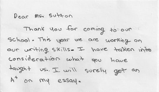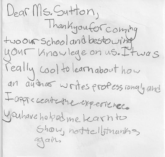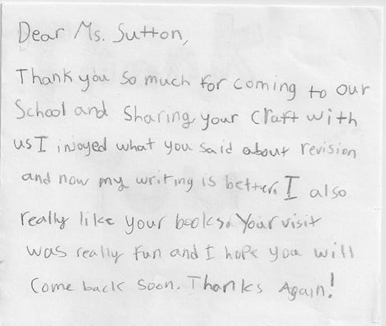 With younger children, I usually explain how an idea eventually becomes a book. But with older students, I talk about character development, revising, descriptive writing – whatever the school requests. I love discovering which points stuck with particular students. And I love the notes that are not just from the head but from the heart, too.