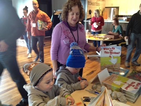 For the second year in a row, An Unlikely Story hosted the Writers’ Loft Holiday Bazaar and Bookfair. Really fun! I got to meet other authors and check out their varied books, met the wonderful Kathy Carroll of the blog Celebrate Children’s Books. And I got to try out the craft she created to go with What’s Up with This Chicken?