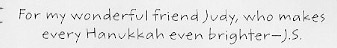 As the dedication says, she comes to our house every Hanukkah for a party featuring my husband’s latkes. And her presence makes the celebration warmer and brighter…for everyone!