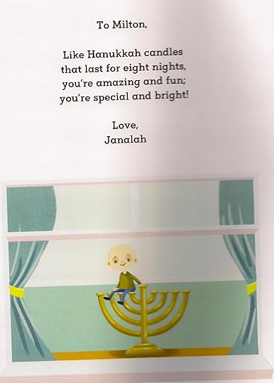 Book # 10 is a rhyming personalized picture book for Hanukkah by Hallmark in which the purchaser chooses the recipient’s name, gender, hair style, hair color, skin color and eye color. Hence, the dedicatee is always different. I ordered one for my then 101 year old dad, Milton, whose hairstyle was “none.” He was tickled by the book, Milton’s Magical Hanukkah.