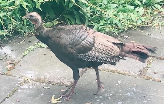 Earlier in the summer a mama turkey with 3 babies were frequent visitors to our yard. Then she showed up with just one baby and limping, likely the result of an animal attack on her and her family.