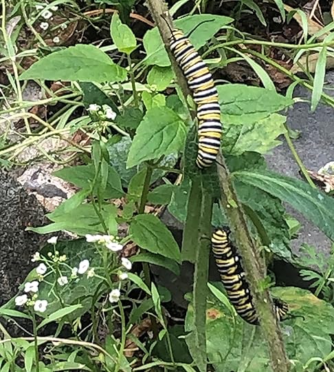 We were pleased to have a nice crop of milkweed plants in our yard this year because we know that Monarch butterfly caterpillars depend on them. Recently, we saw these gorgeous Monarch caterpillars across the patio from the milkweed, chowing down on a different plant!
