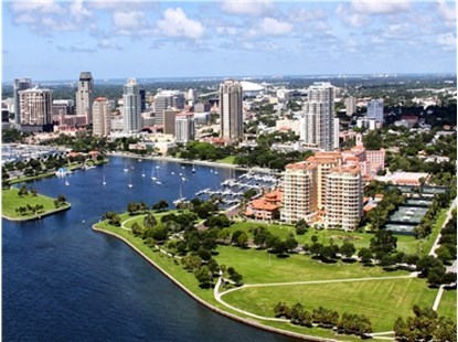 Due southeast from it sets the salmon painted Vinoy resort and park, and in the distance the Tampa Bay shipping channel.