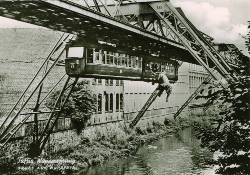 Elephant breaks free from German monorail, 1950.On 21 July 1950, in town of Wuppertal, Germany, an elephant called Tuffi, jumped off the local monorail, and the photographer was lucky to get the shot. The elephant has survived the fall, due to the low height and the water below, and lived for next 40 years.