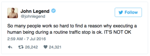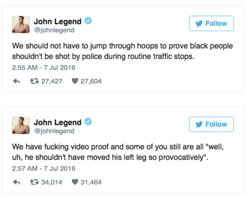 Singer John Legend has lent his voice to the chorus of outrage that’s cropped up in the wake of two high-profile police killings of black Americans this week. His tweets echo a similar sentiment shared by Larry Wilmore on The Nightly Show.