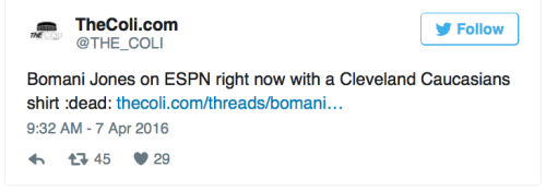 Bomani Jones wore a shirt mocking the Cleveland Indians live on ESPNOn Thursday morning, Bomani filled in for Mike Golic on Mike & Mike wearing a T-shirt that imitated the highly contentious Cleveland Indians mascot — but with a white figure and the word “Caucasians.” The white outrage rolled in, with Bomani taking the time to expertly shut down one troll.