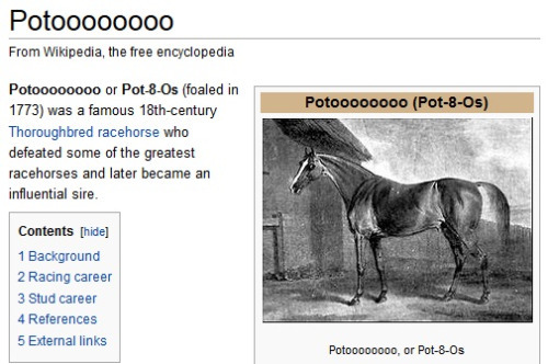his name was originally “potatoes,” and his owner, willoughby bertie, told the stable lad who helped him to write the horse’s name on a feed bin. the boy misheard it as, literally “pot-eight-o’s” and wrote it with 8o’s. bertie found it so funny that he kept that as the horses name.