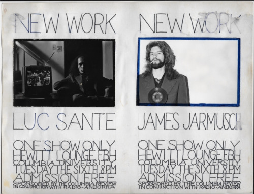 Flier for a reading at Columbia University featuring Luc Sante and Jim Jarmusch, 1976.