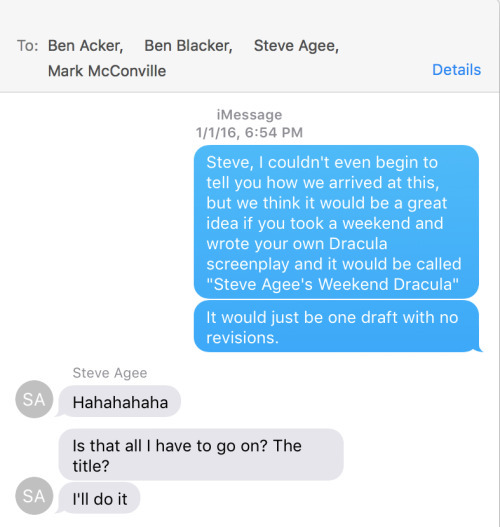 Steve left a party by saying, in a somewhat loud but very cordial tone,“Good evening.” Once he was out the door, I said,“What a Dracula!” Ben Blacker replied, simply,“’Steve Agee’s Dracula.’” And then this.
