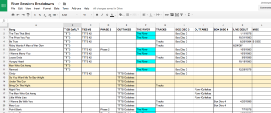 I filed six pieces about the River box set today. This is the spreadsheet I created to track every known song from the River sessions.