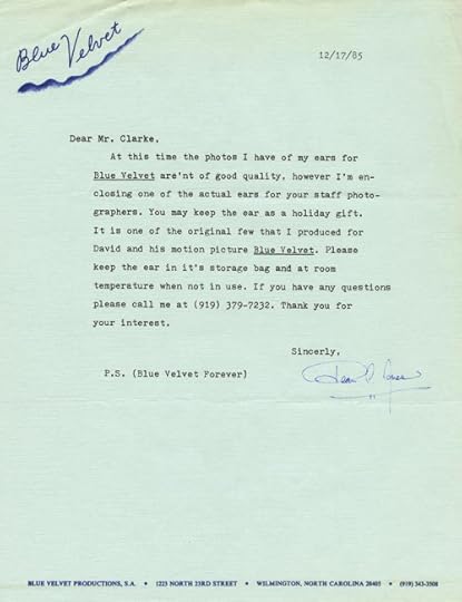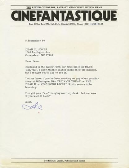 Among the films featured in this horror/fantasy/science fiction magazine was David Lynch’s cult classic Blue Velvet, in which a severed ear sets the film’s plot into motion. In December 1985, makeup artist Dean C. Jones sent a prosthetic ear he crafted for the film to Cinefantastique publisher and editor Frederick S. Clarke, with the instructions “Please keep the ear in it’s [sic] storage bag and at room temperature when not in...