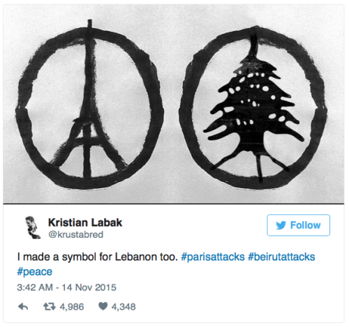 A Scottish designer wants to remind everyone that victims of the Paris attack aren’t the only recent victims of terrorism. Kristian Labak wrote"I made this for people of a similarly timed tragedy to not feel forsaken. Unfortunately I cannot create a symbol for everyone, but…”