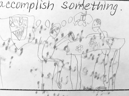 The assignment was to write about a time you worked with someone to accomplish something together. What Henry wrote, spelling corrected, beneath the drawing of the math devil fighting boba fett in his thoughts: