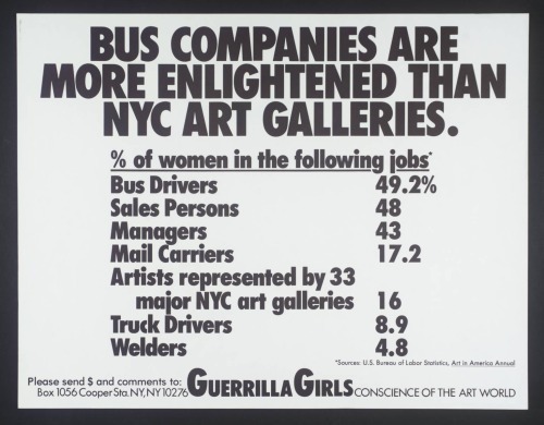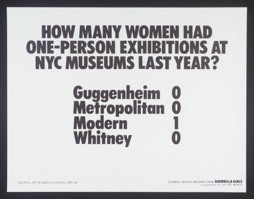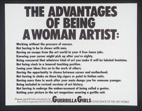 Since their inception in 1984 the Guerrilla Girls have been working to expose sexual and racial discrimination in the art world, particularly in New York, and in the wider cultural arena. The group’s members protect their identities by wearing gorilla masks in public and by assuming pseudonyms taken from such deceased famous female figures as the writer Gertrude Stein (1874-1946) and the artist Frida Kahlo (1907-54). They formed in response t...
