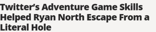 Polygon:Comic writer gets stuck in a hole and Twitter saves him, point-and-click adventure styleThe Guardian:Canadian comic artist stuck in rain-soaked skate bowl saved by Twitter The Huffington Post:Ryan North Gets Trapped Inside A Skate Bowl With His Dog, Hilarity EnsuesThe Mary Sue: Twitter’s Adventure Game Skills Helped Ryan North Escape From a Literal HoleAnd if you want more...