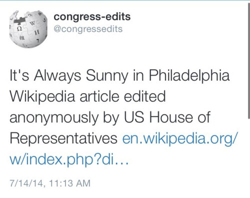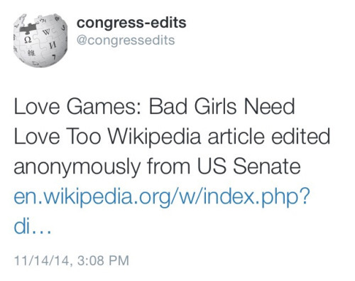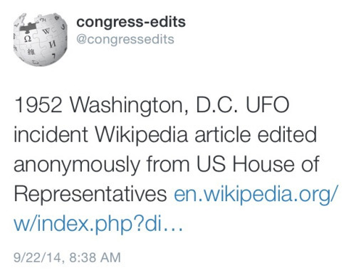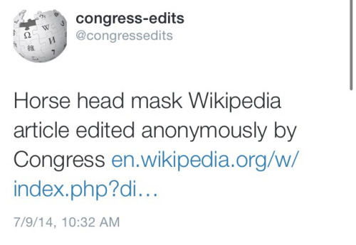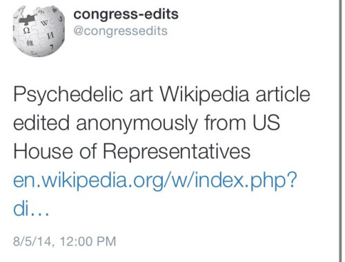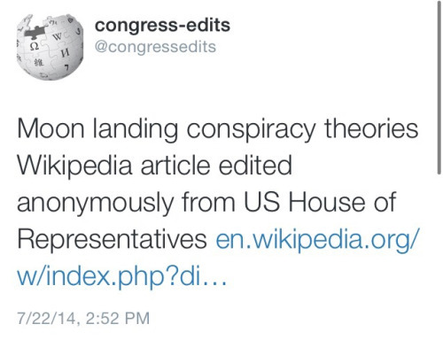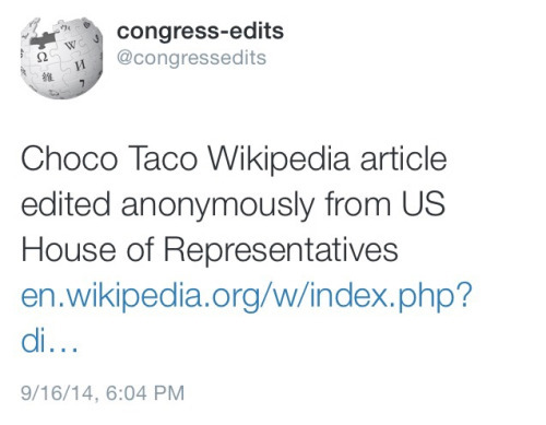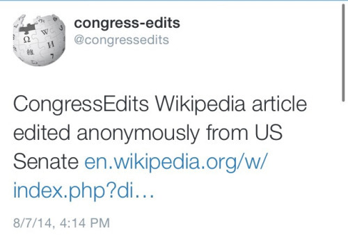 Some of the best tweets by @congressedits, a bot that logs all of the wikipedia revisions made by IP addresses in the US congress.