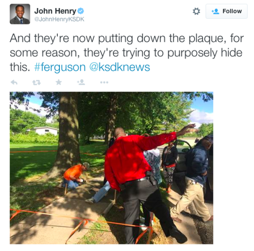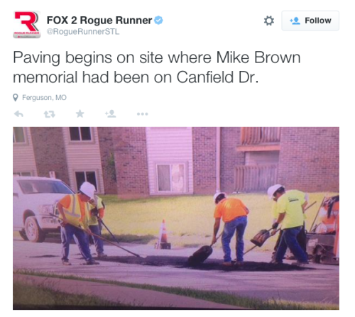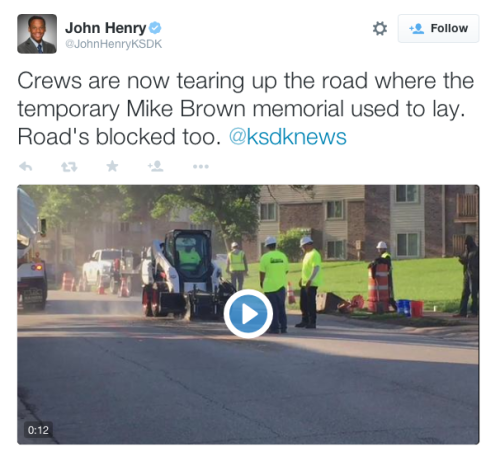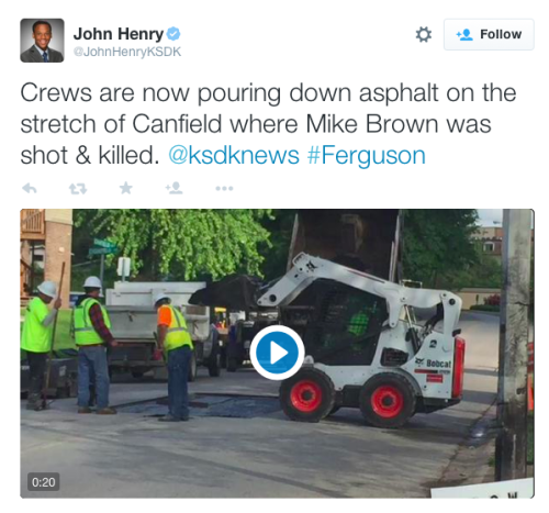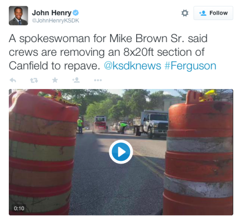 As requested by the Brown family, workers resurface the parts of Canfield Drive where Mike Brown’s memorials stood for over 9 months.