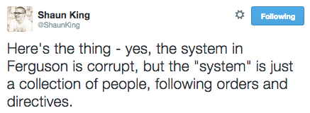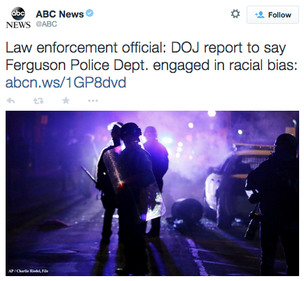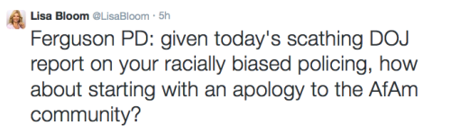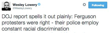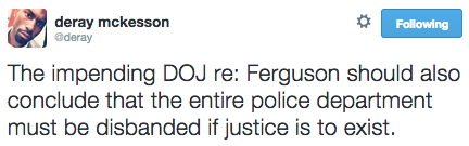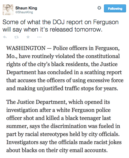 No Justice, No Peace (3/3/15): The Department of Justice will be releasing a report tomorrow that affirms what we already knew: the Ferguson Police Department are a bunch of racists fucks. Not some of the department— ALL OF THE FERGUSON POLICE DEPARTMENT. #staywoke #farfromover