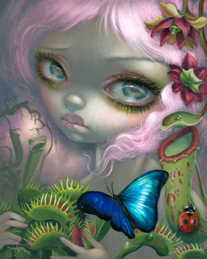 Next – I have two new original paintings to show you! The first one was the result of the free custom painting I gave away at Patreon a few weeks back – the winner went with a dark Alice in Wonderland/Caterpillar them – the original has sold but we have prints & canvases for sale here, she is “Faces of Faery 238”! The second original painting is one that sold at my Insectarium show – her name is “Insectarium II: Carnivorous Plants” – prints and canvases are available here. To see any other original paintings that are actually still available to purchase (they tend to sell quickly!), click here.