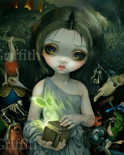 Another piece from my Myths & Mermaids show at Pop Gallery Orlando at Downtown Disney, Pandora is a new painting based on the “Pandora’s Box” myth. In my interpretation, she has already opened the box and behind her is a scene inspired by medieval monsters and demons along the lines of Hieronymus Bosch, Bruegel, and Huys (representing the evils of humanity released from the box). Amidst all the chaos, the last critter out of the box is “Hope” – which I have chosen to represent as a glowing butterfly. The butterfly and the innocence of Pandora’s soulful dark eyes make this a painting of hope, despite the evils of the world.