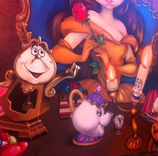 Sneak preview! I’m touching up “Be Our Guest” – a small piece of a large new Disney painting I will be debuting at Disneyland’s WonderGround Gallery in Anaheim California (I’ll be there March 1st at 11am-1pm to sign autographs & debut my latest pieces for Disney). This is an original acrylic painting featuring Princess Belle, Lumiere, Cogsworth, Mrs. Potts, Chip, etc. – the finished piece will debut at the event as a WonderGround Gallery Exclusive. I’m pretty much finished with the painting now – just had to fix some of the colours on Mrs. Potts to match the approved palette. This piece is ©Disney and a licensed Disney product. Details about the event are here: