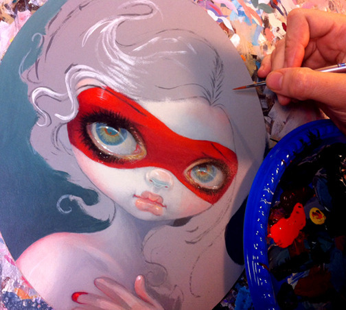 Work-in-progress! This painting – “Red Mask” is for an upcoming group show at the Eight And Sand Gallery in Seattle, WA – the theme of the show is “Red”, and I’m just now working on the bright RED facepaint mask of this lovely girl. Still got several hours of work to do on this one, but she is coming along nicely. The “Red” show will run from February 8-March 9 at Eight and Sand Gallery in Georgetown, Seattle. If you are interested in the original painting, contact the curator Alex at eightandsand@gmail.com – let her know you are interested in being on contact list for “Red Mask” by Jasmine Becket-Griffith. This original painting is acrylics on an 8×10 oval, will be in a silver frame and will be priced at $2200. While I won’t be able to attend the show opening in person unfortunately, I will however be coming to Seattle on February 21-23 for FaerieCon West, so if you are in the area definitely check out both events!