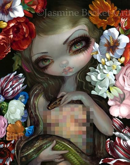 This is a painting I did for Modern Eden Gallery’s “Femme to Femme Fatale” show, curated by Beautiful Bizarre Magazine. The original sold at the show. With my contribution, “Femme Fatale,” I have explored some of the notions that pop into my head when I hear the words. As a generic stock character a Femme Fatale is somewhat of a trope – an archtype of a seductive dangerous woman, which I definitely embodied in this piece, but I wanted to take the idea a bit further. I’ve juxtaposed some stereoptypically “feminine” imagery (in this case, delicate flowers, Winter’s 19th Century “Cleopatra” illustrations) with “danger” imagery (slithery snake) alongside the beautiful female figure. However rather than a standard nude Eve theme, I have handpainted an approximation of a “censored” pixellation blur.