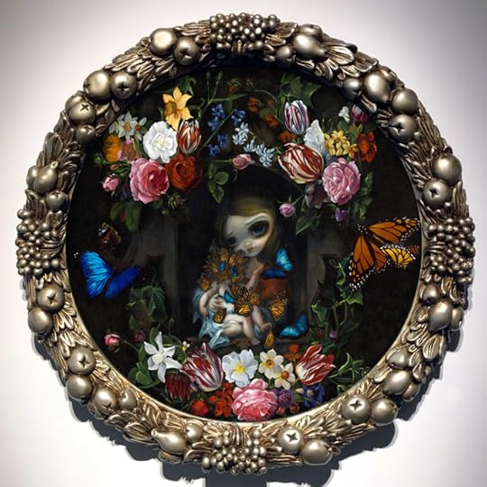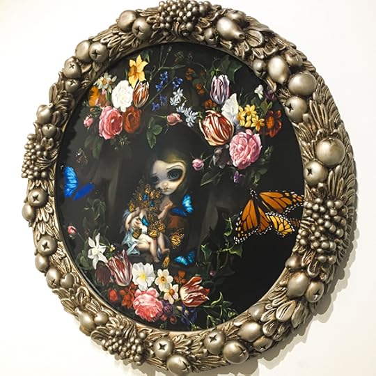 My darling giant painting for the Corey Helford Gallery - this original painting is available - "Étreinte de Papillons " here - $15,000 - 37" framed, original acrylic painting on a round panel, if you are interested simply email Jan at: jch@coreyhelfordgallery.com - or call (310) 287-2340 - they can ship worldwide and may be open to working with payment plans, etc.