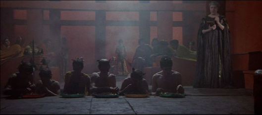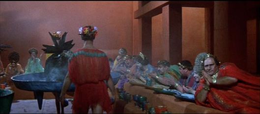 We’ve jumped ahead to a later point in the dinner from Trimalchio and Fortunata’s wild dance. Fellini really loves allowing a scene to reach a noisy crescendo and then immediately jump cutting to a quiet, calmer scene. It underscores the fragmentary nature of the narrative.