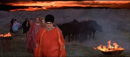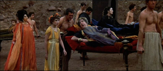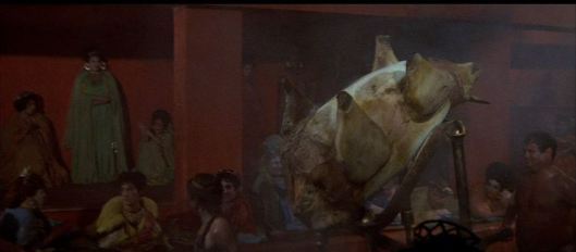 Illustrating the episodic nature of the novel and film plot, Encolpius and his new friend Eumolpus make their way next to a lavish dinner party thrown by a vulgar freedman named Trimalchio. Encolpius’ story, and his role as main character, almost completely recedes into the background for a bit. He becomes the observer, our eyes, watching the absurd spectacle unfold in front of him.