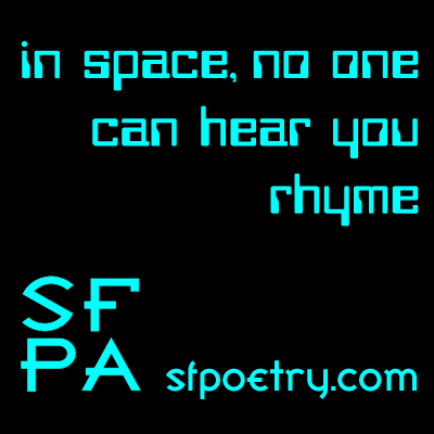 Check out the new t-shirts sold as a fundraiser by the Science Fiction Poetry Association (of which, I’ve been a member since something like 1989 — if you’re a genre poet, join us!). I’m honored they chose my proposed slogan for the t-shirt design…