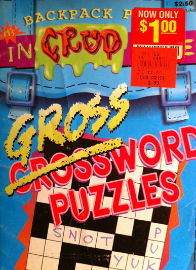 Of course, I also approve of the impossible-to-find book, Backpack Power’s In-CRUD-ible Gross-word Puzzles by “I. Seymour Crudd,” too — which at one point refers to a puzzle as a “pustule.” Gotta love that. Though I hate to depart with it, I will be tearing pages out of my recently discovered copy of this book and sending them at random to readers when I correspond with them by snail mail. If that’s you, enjoy!