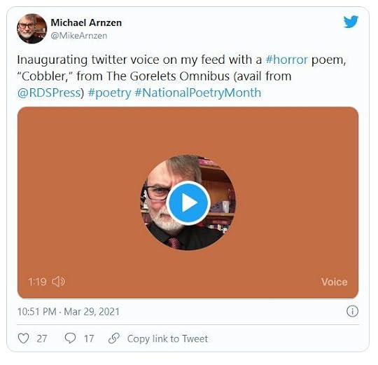 Speaking of audio, I discovered Twitter Voice on my phone app, and decided to play with it by posting random recitations of my horror poetry on twitter all month. You can track these and listen to all of them as they go live here.