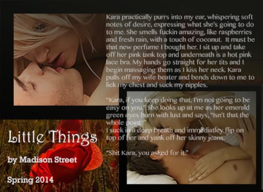 Well, I just finished reading Chasing Olivia by Micaela Smeltzer and I am seriously going through some heavy withdrawal! I’m hoping to read a few more books this month. On my list are Night Owl, Banded Together, Alluring Seduction, and A Tragic Wreck.And just for fun how about a teaser from Little Things!?