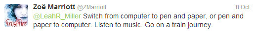 I was in a slight slump the other day. I wanted my mind to wander, to imagine all those lovely, awesome new book ideas, but my brain just didn't want to cooperate. So, I asked Twitter and the fantastic ladies over on the WrAHM Facebook group if anyone had tips or tricks for getting the muse into gear. I received tons of great responses, and here they are! (Please click on their tweets to go to their twitters. Then follow these ladies because they're AWESOME!)